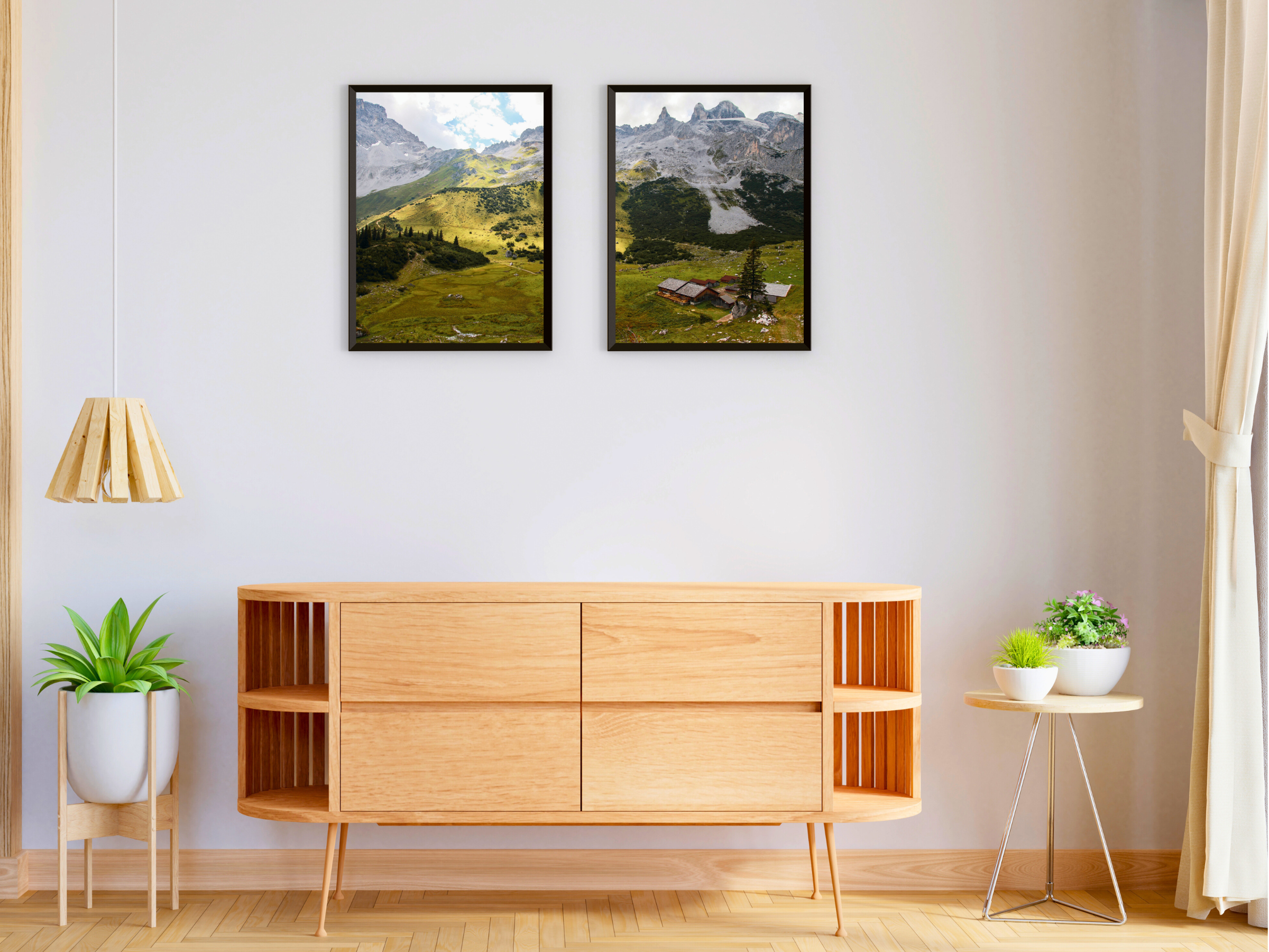 Sur un alpage en montagne - Photographie en deux parties - Décoration murale imprimable représentant un paysage de montagne idyllique. Parfaite pour une décoration intérieure inspirée par la nature et comme œuvre d'art paysagère .
