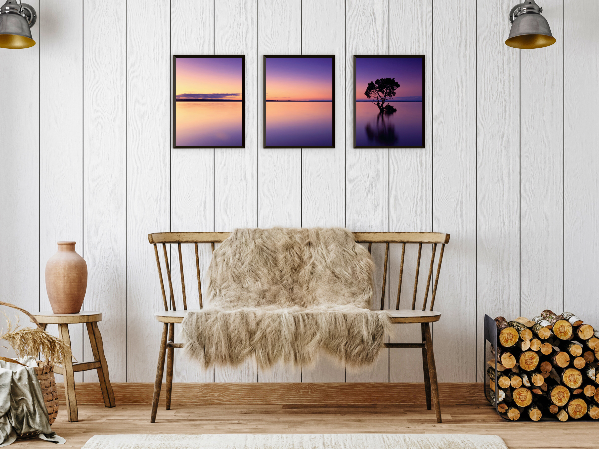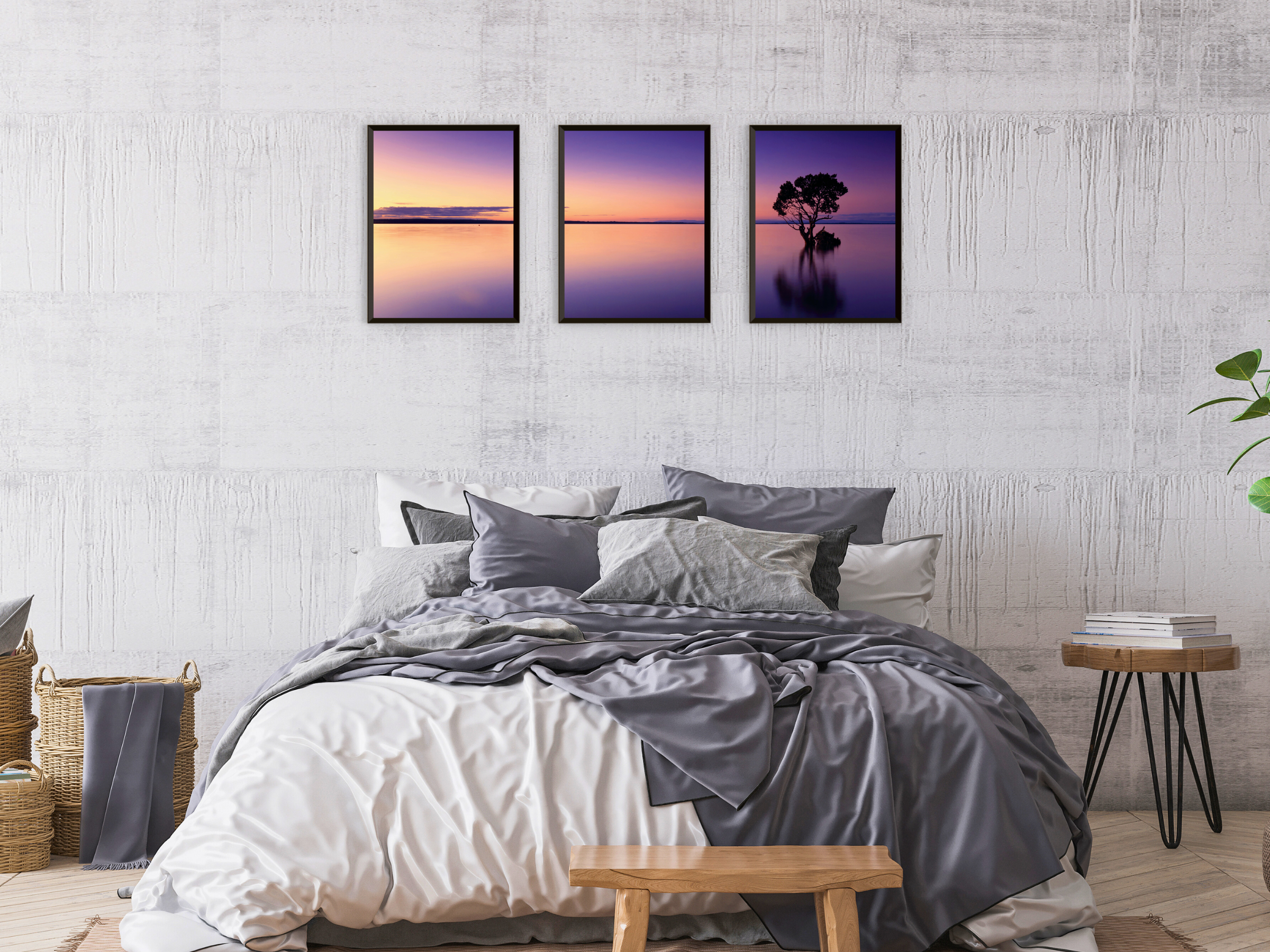 Triptyque photographique « Arbre dans un lac » – Décoration murale imprimable en 3 parties représentant un arbre captivant dans un lac . Une œuvre d'art idéale pour créer une ambiance relaxante dans votre intérieur.