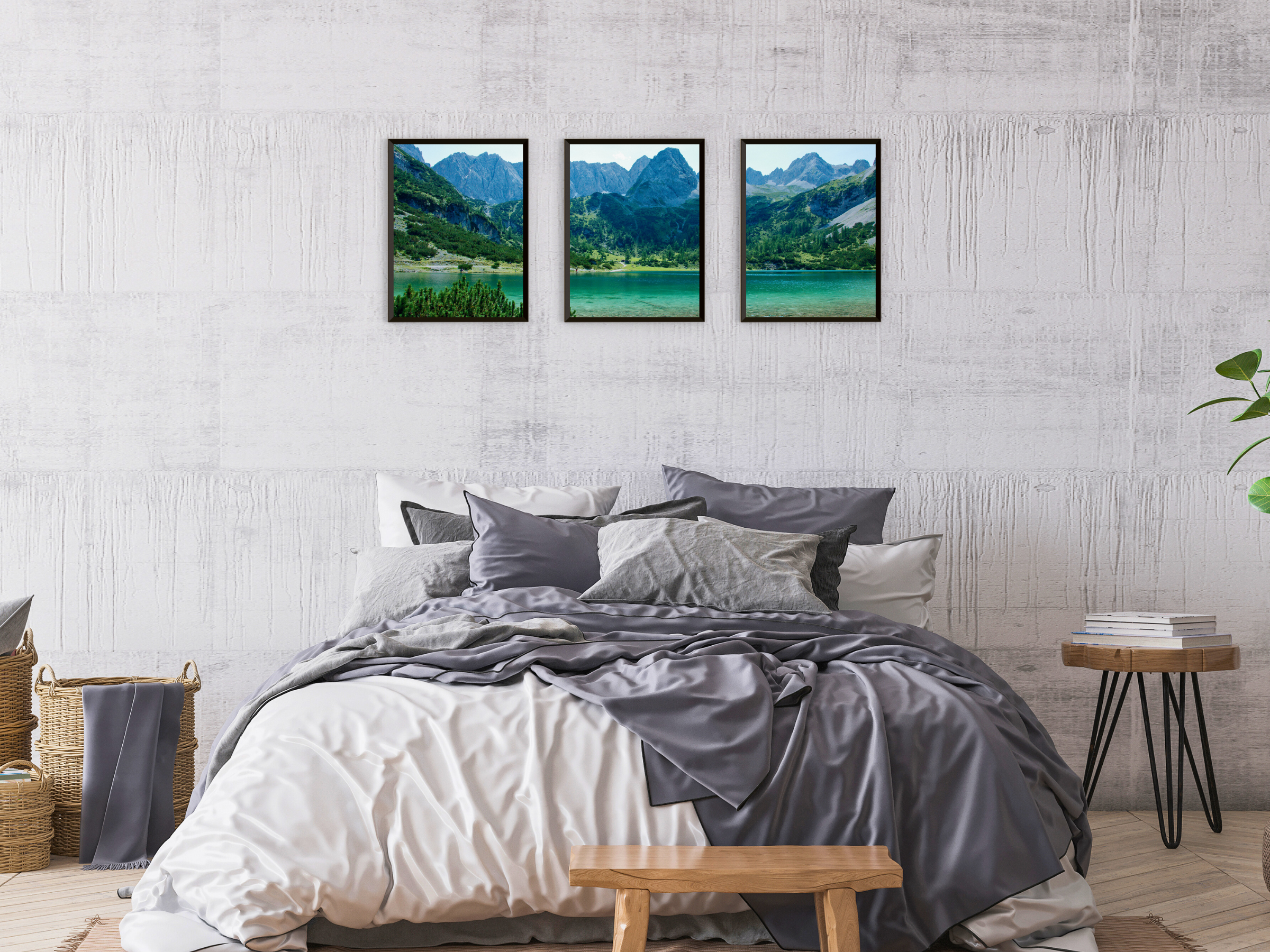 Triptyque photographique « Lac de montagne » – Décoration murale en trois parties représentant un lac de montagne paisible entouré par la nature . Idéal pour imprimer une photo et apporter une touche de nature à votre intérieur.