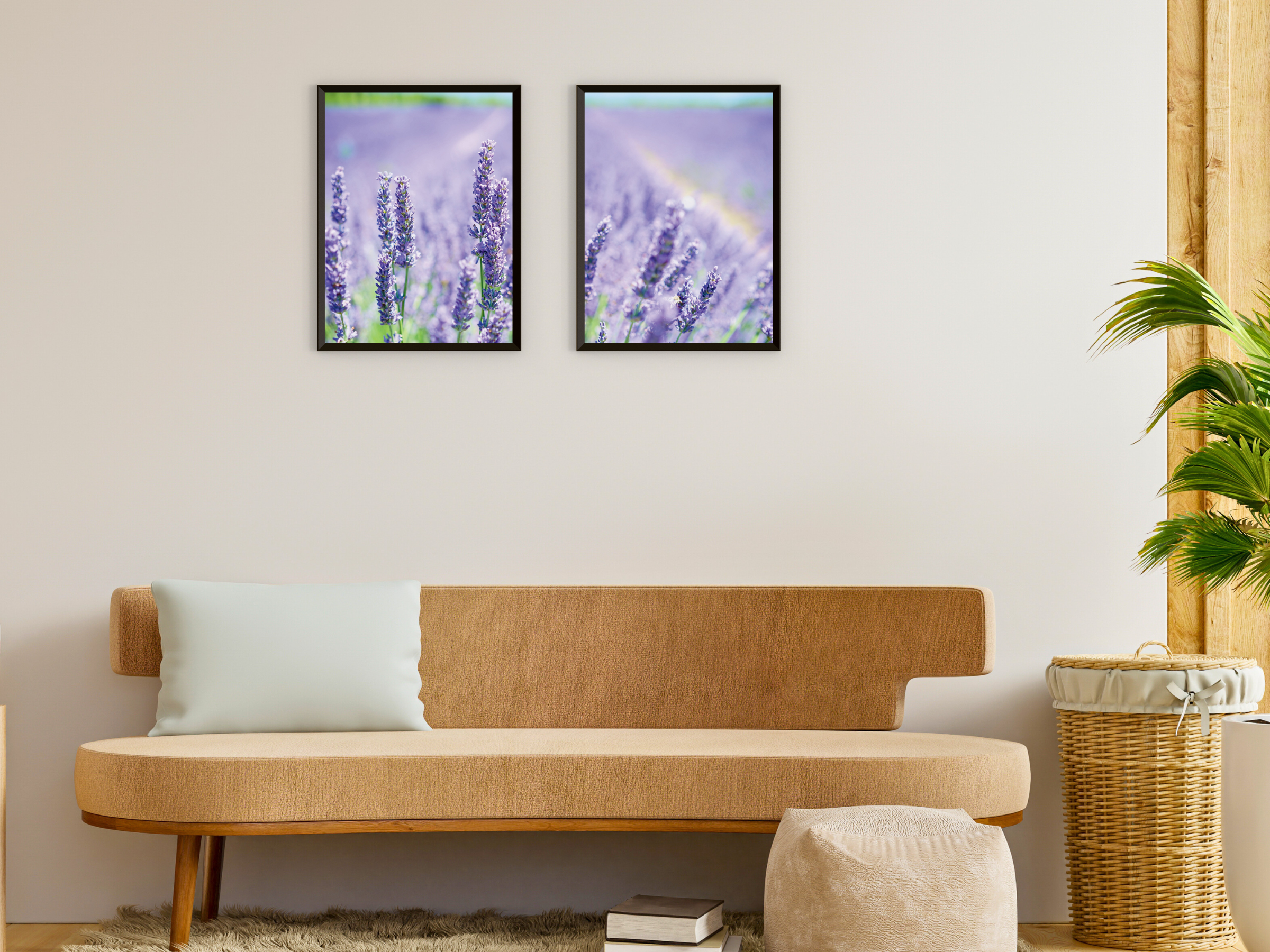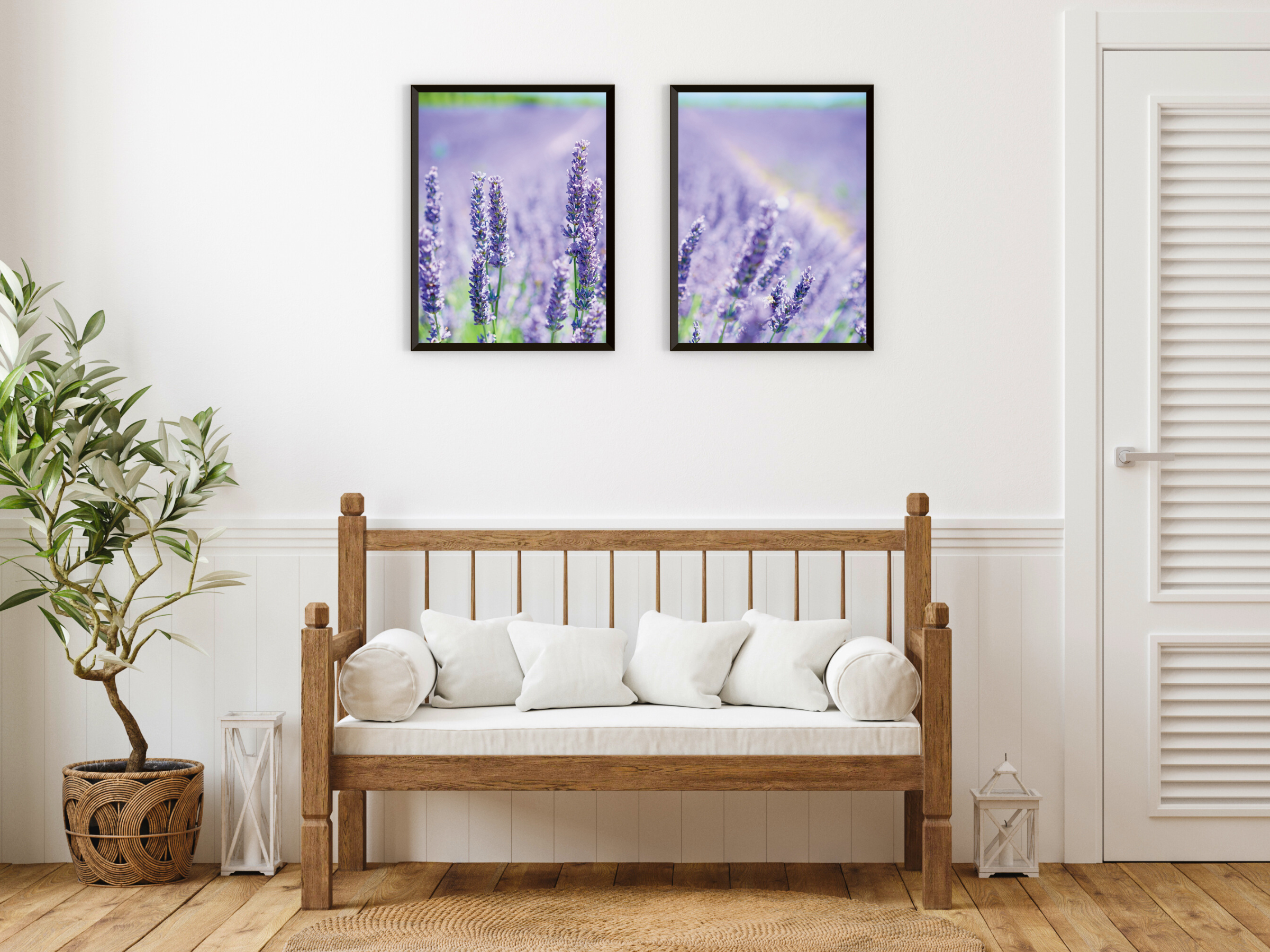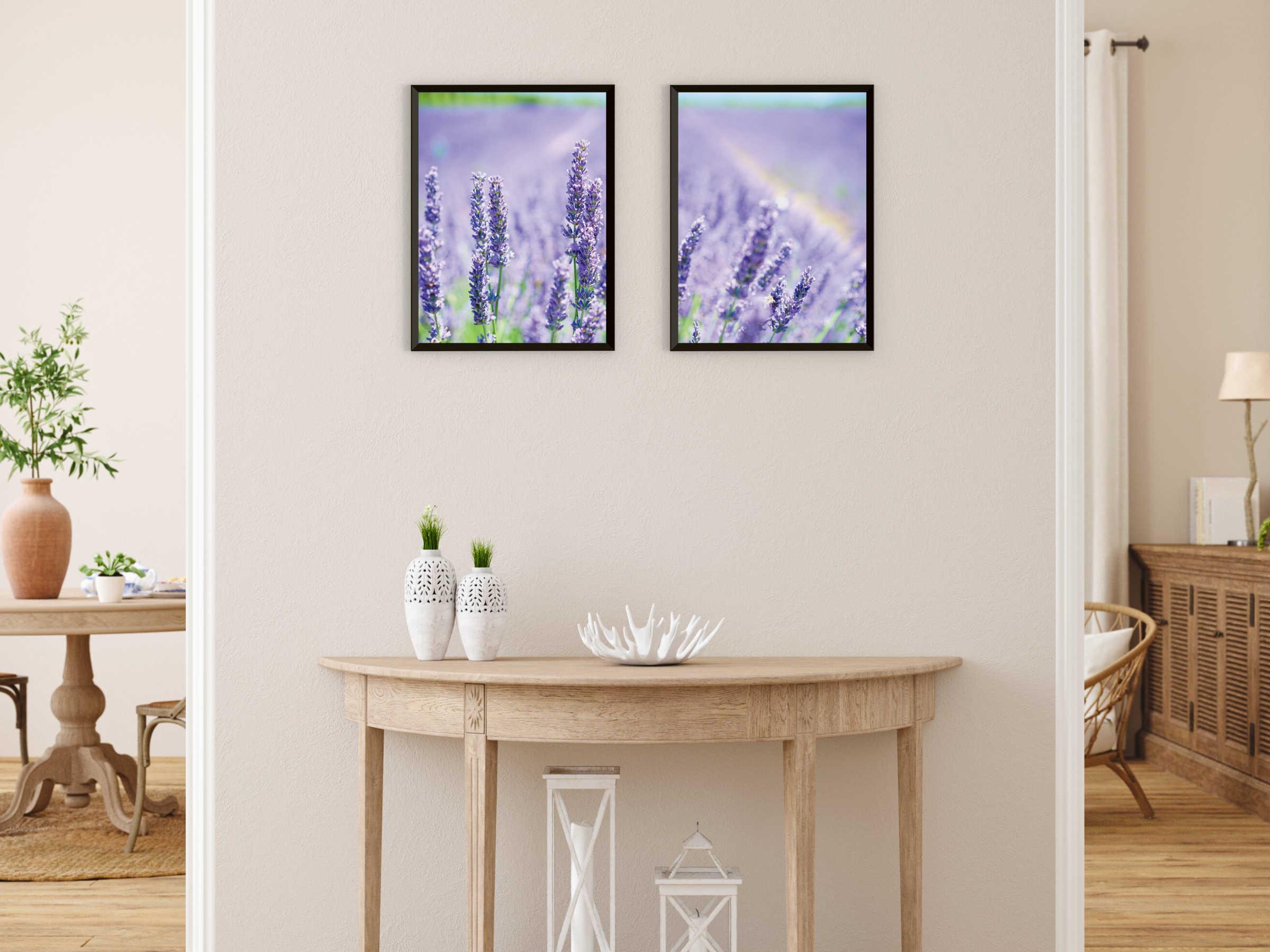 Un champ de lavande en images – une affiche imprimable en deux parties représentant un magnifique champ de lavande . Idéale pour une décoration intérieure apaisante, inspirée par la nature .