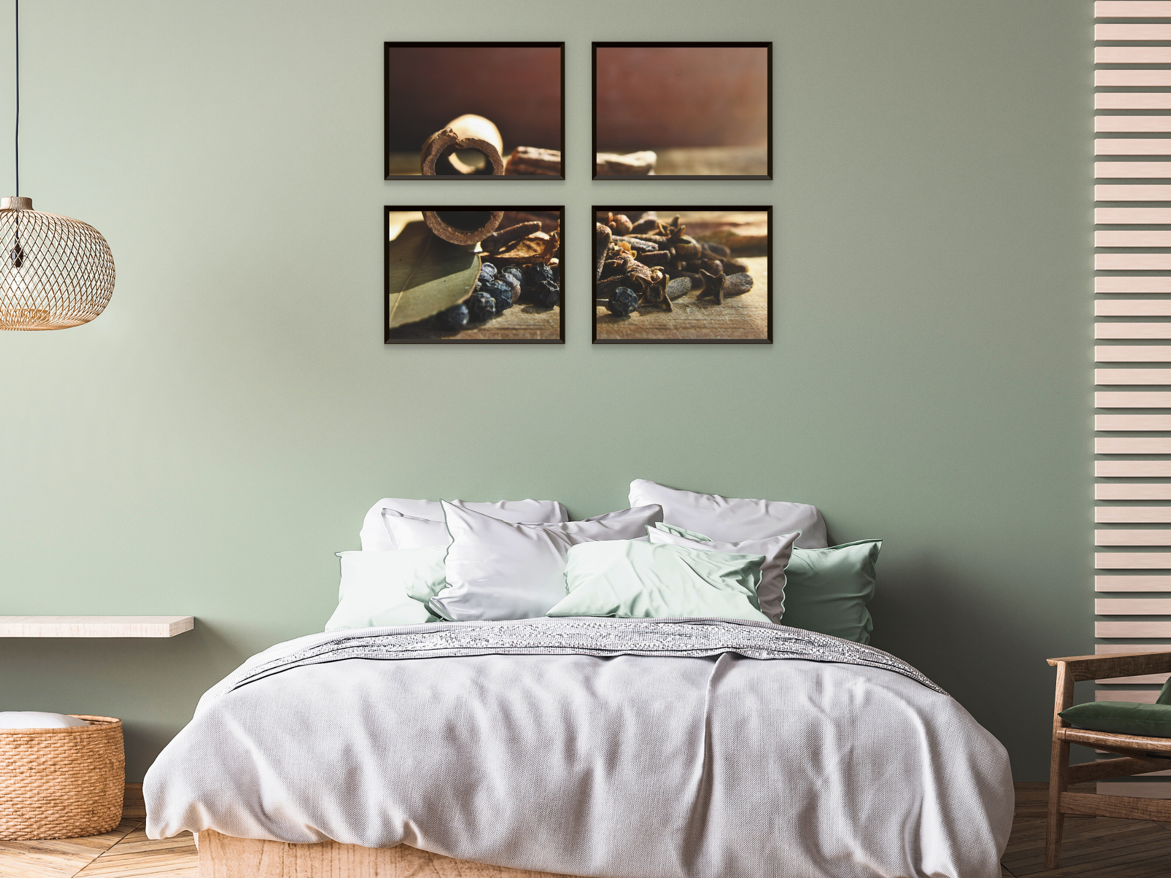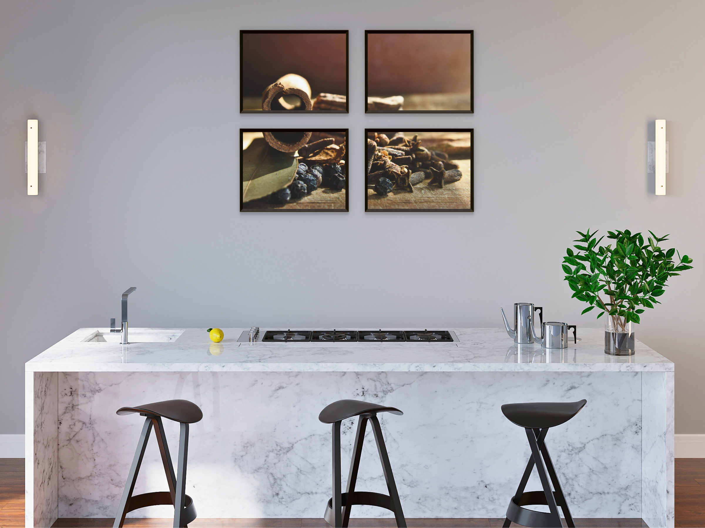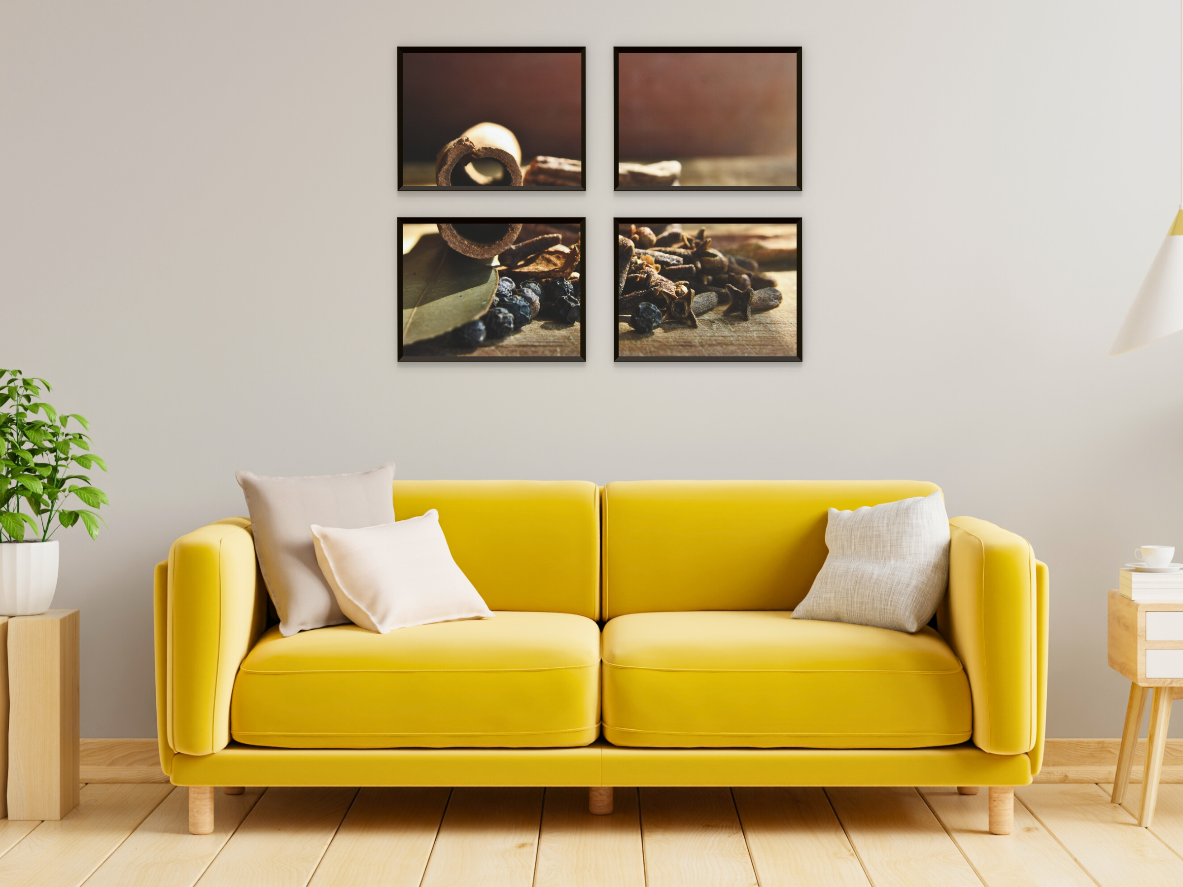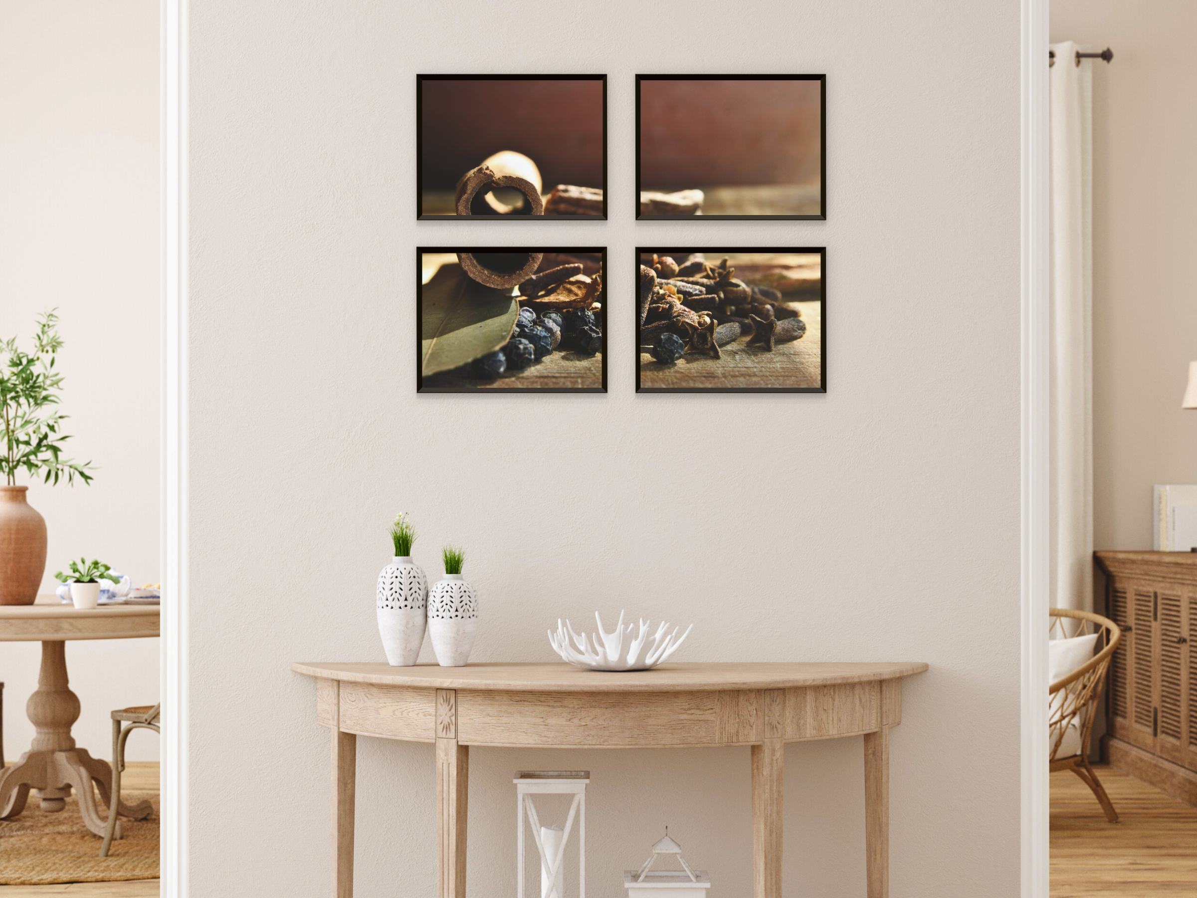 Photographie d'épices : Une photographie en quatre parties présentant un assortiment éclatant d' épices . Parfaite pour décorer vos murs et idéale pour la cuisine ou la salle à manger . Apportez couleur et parfum à votre intérieur grâce à cette photographie de nature .