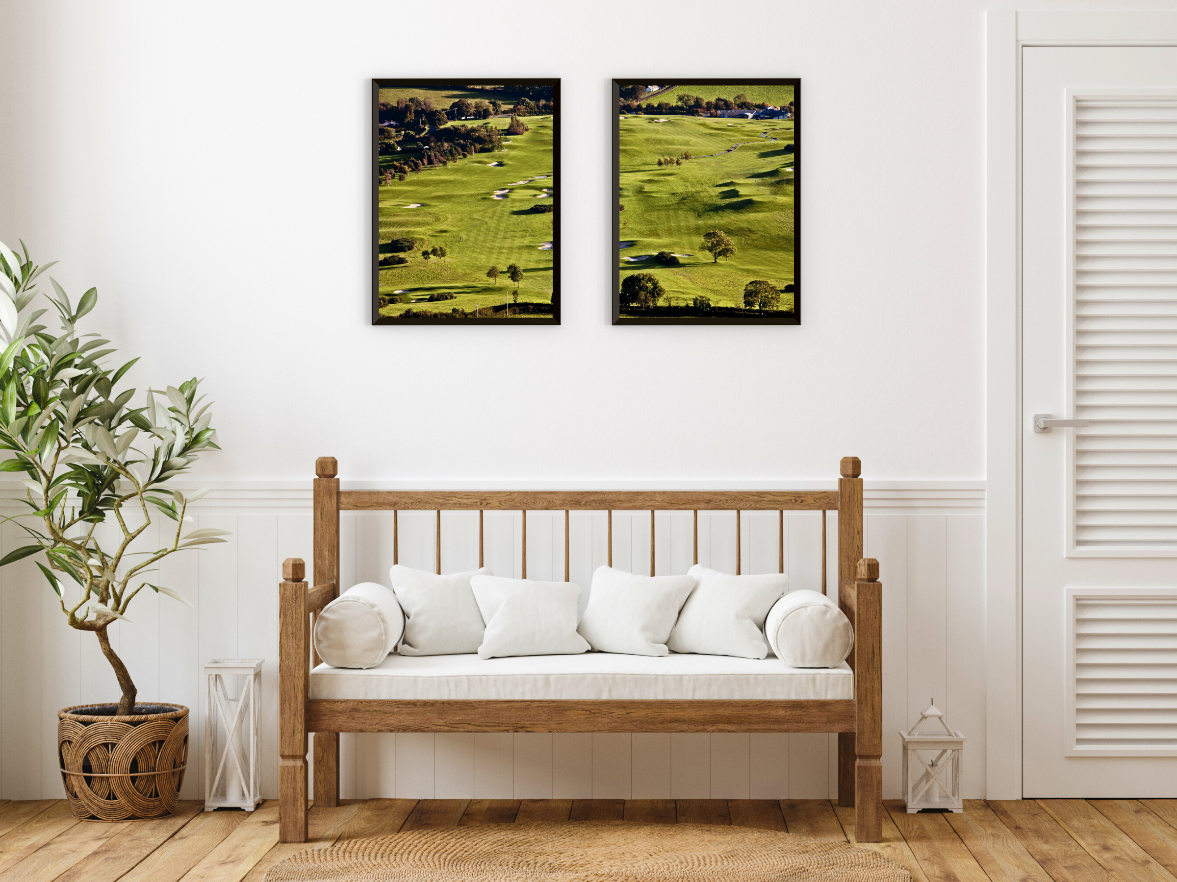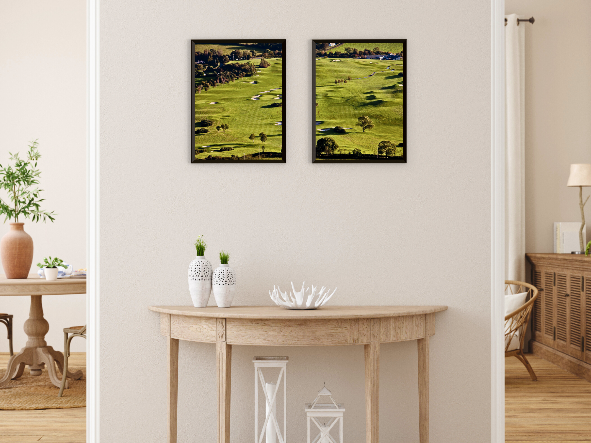 Photographie divisée d'un parcours de golf verdoyant – Décoration murale imprimable en 2 parties axée sur l'art de la nature et du paysage , idéale pour une atmosphère de vie paisible.