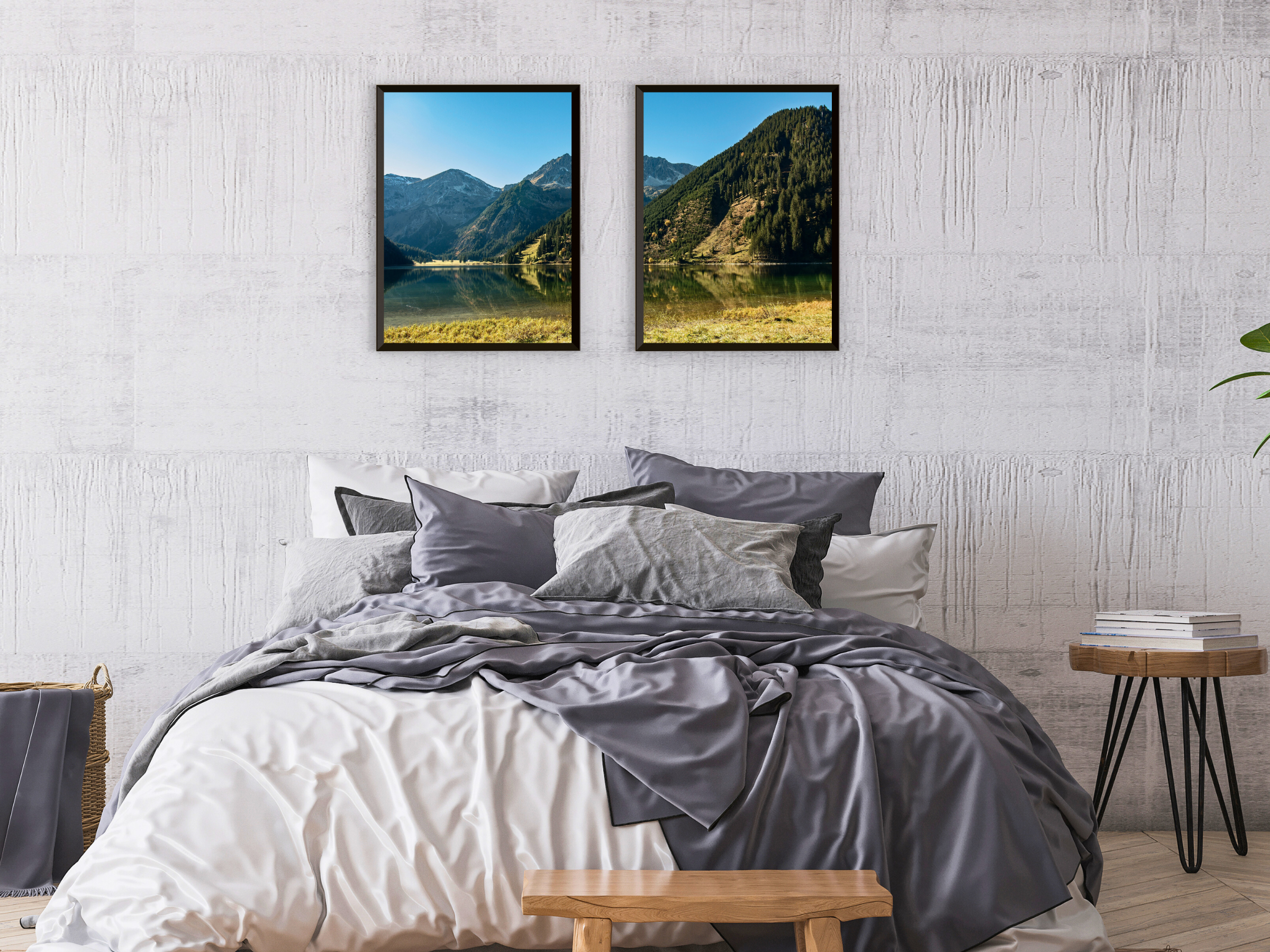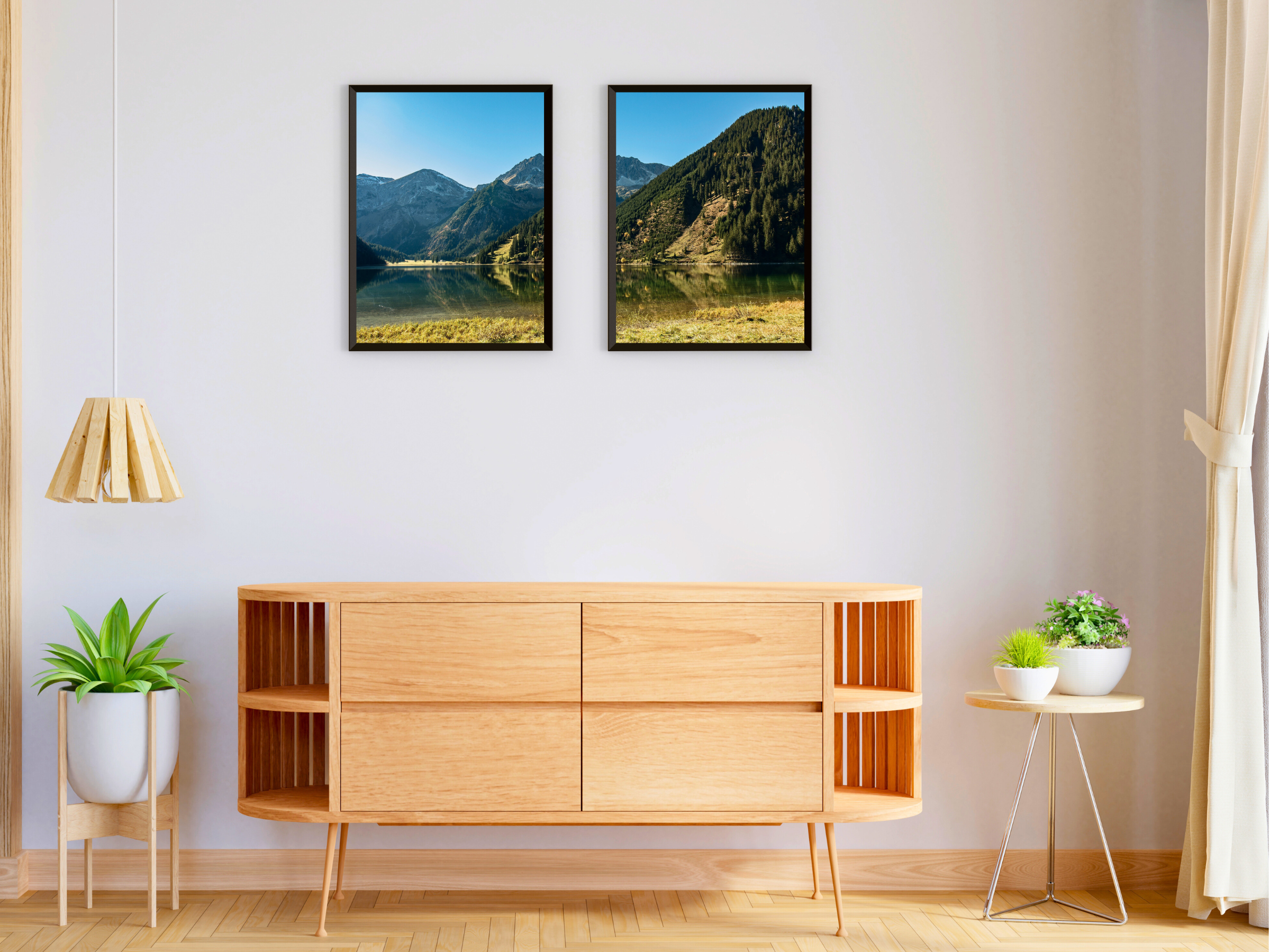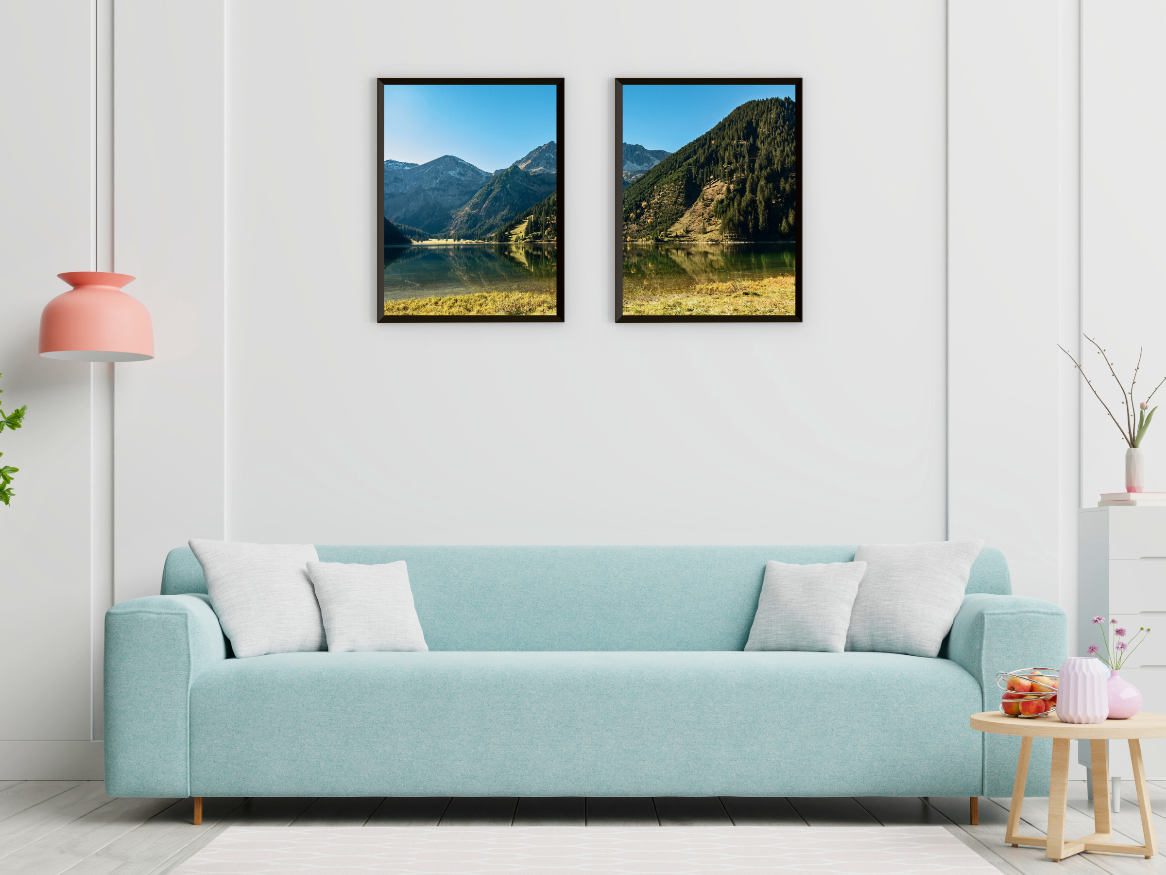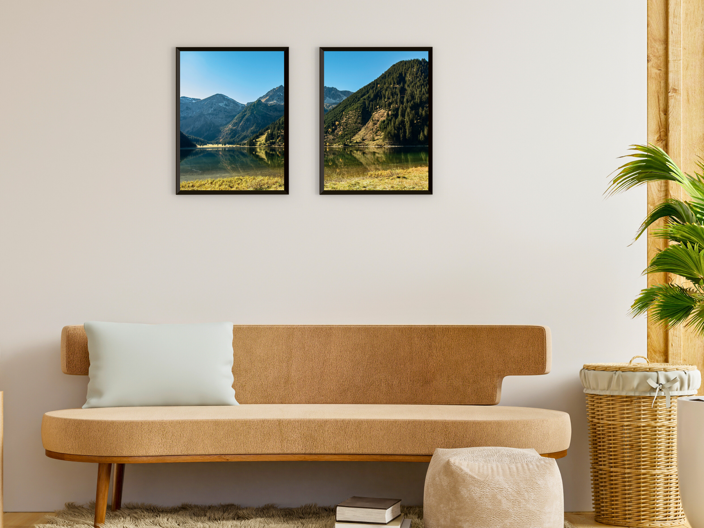 Photographie en deux parties d'un paysage de montagne idyllique – Décoration murale imprimable en deux parties représentant un paisible paysage de montagne . Idéal pour créer une ambiance naturelle et apaisante dans votre intérieur.