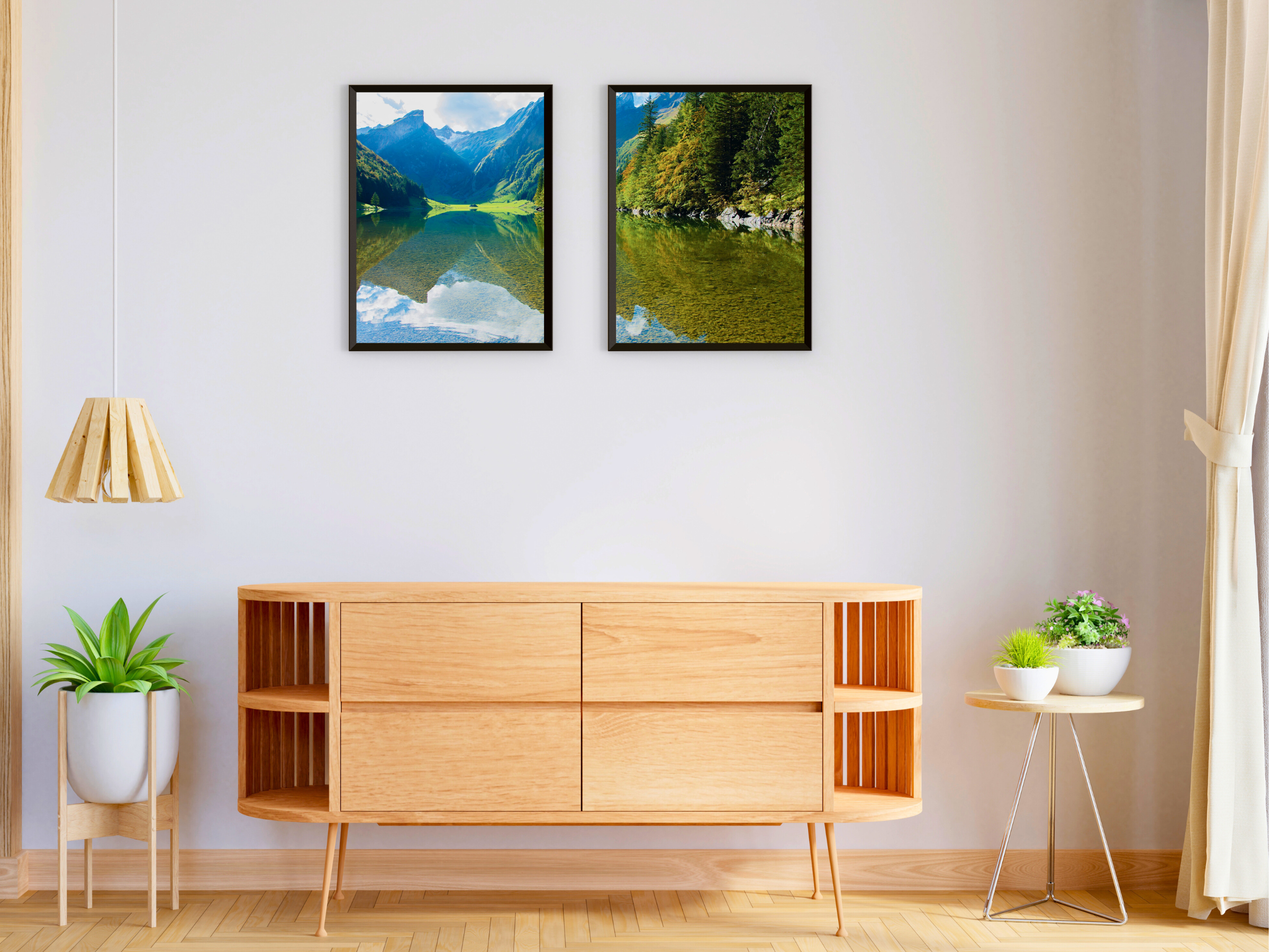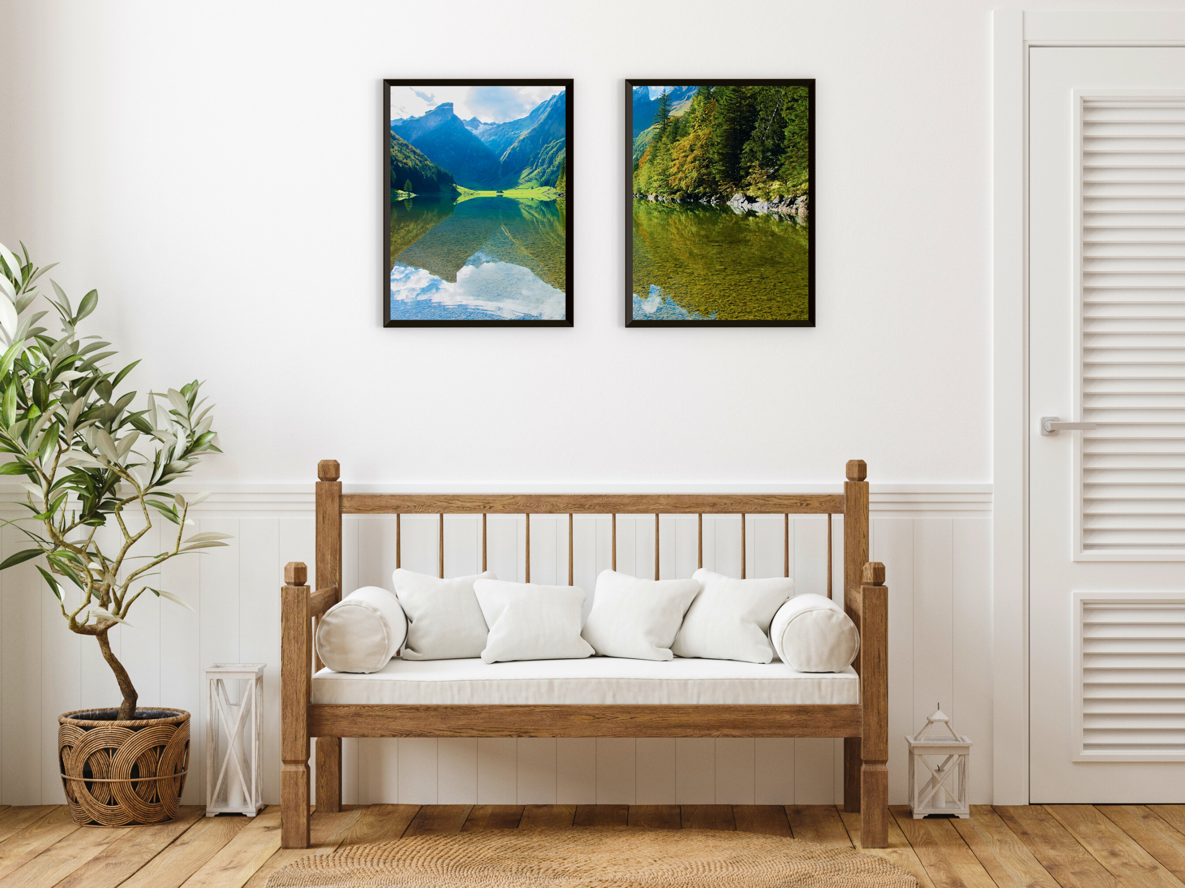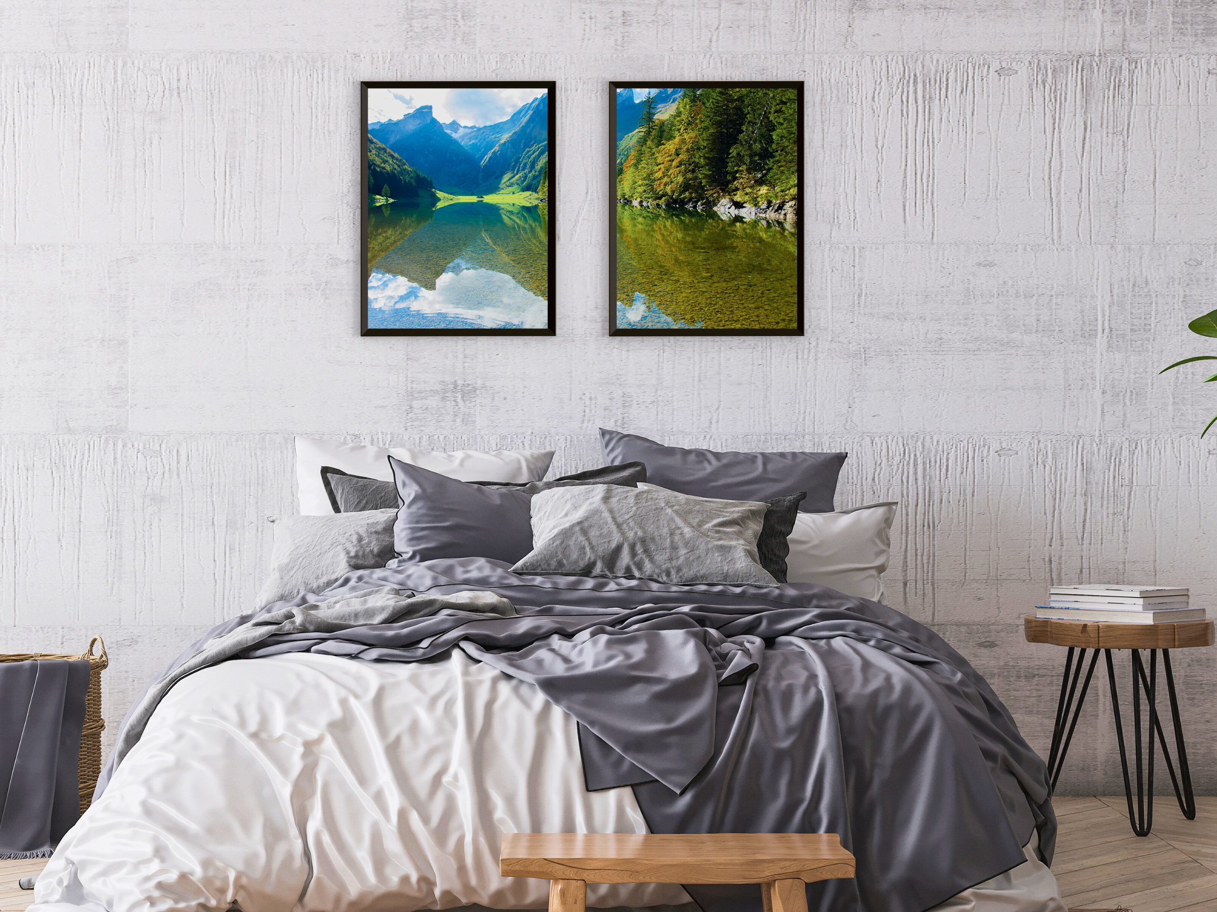 Photographie en deux parties d'un lac de montagne paisible – Décoration murale imprimable en deux parties représentant un lac de montagne serein entouré par la nature. Idéal pour créer une ambiance naturelle et apaisante dans votre intérieur.