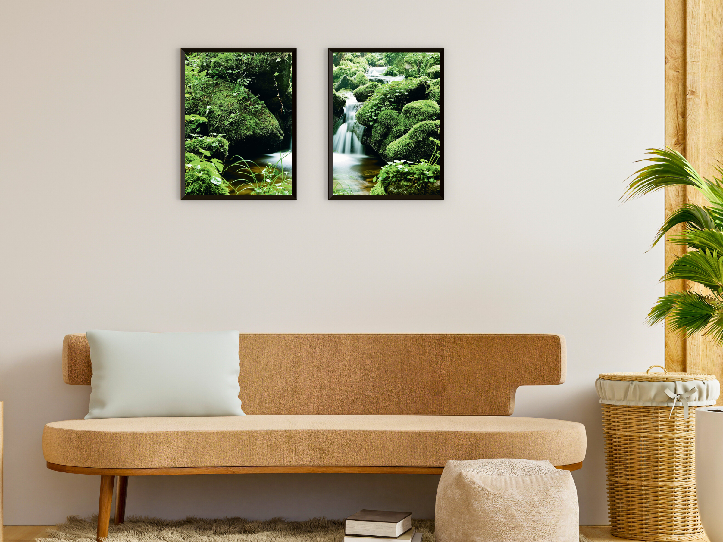 Photographie en deux parties d'un ruisseau moussu – Art mural imprimable . Découvrez la sérénité d'un ruisseau recouvert de mousse – idéal pour les amoureux des paysages et de l'art naturaliste .