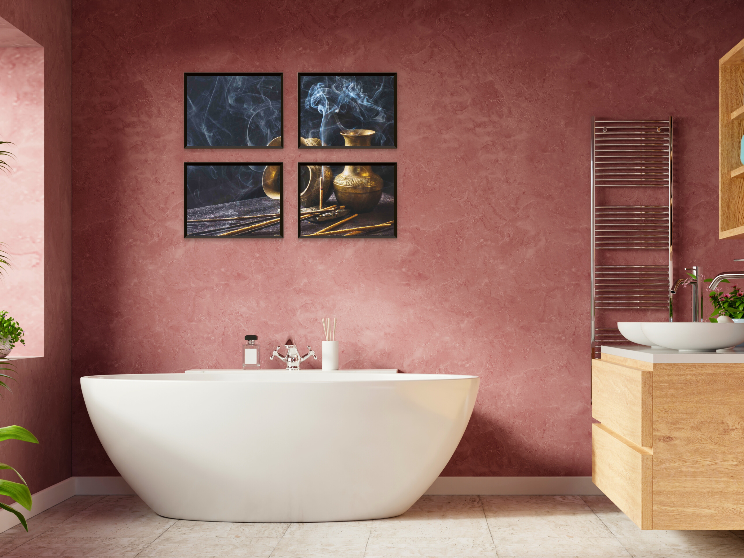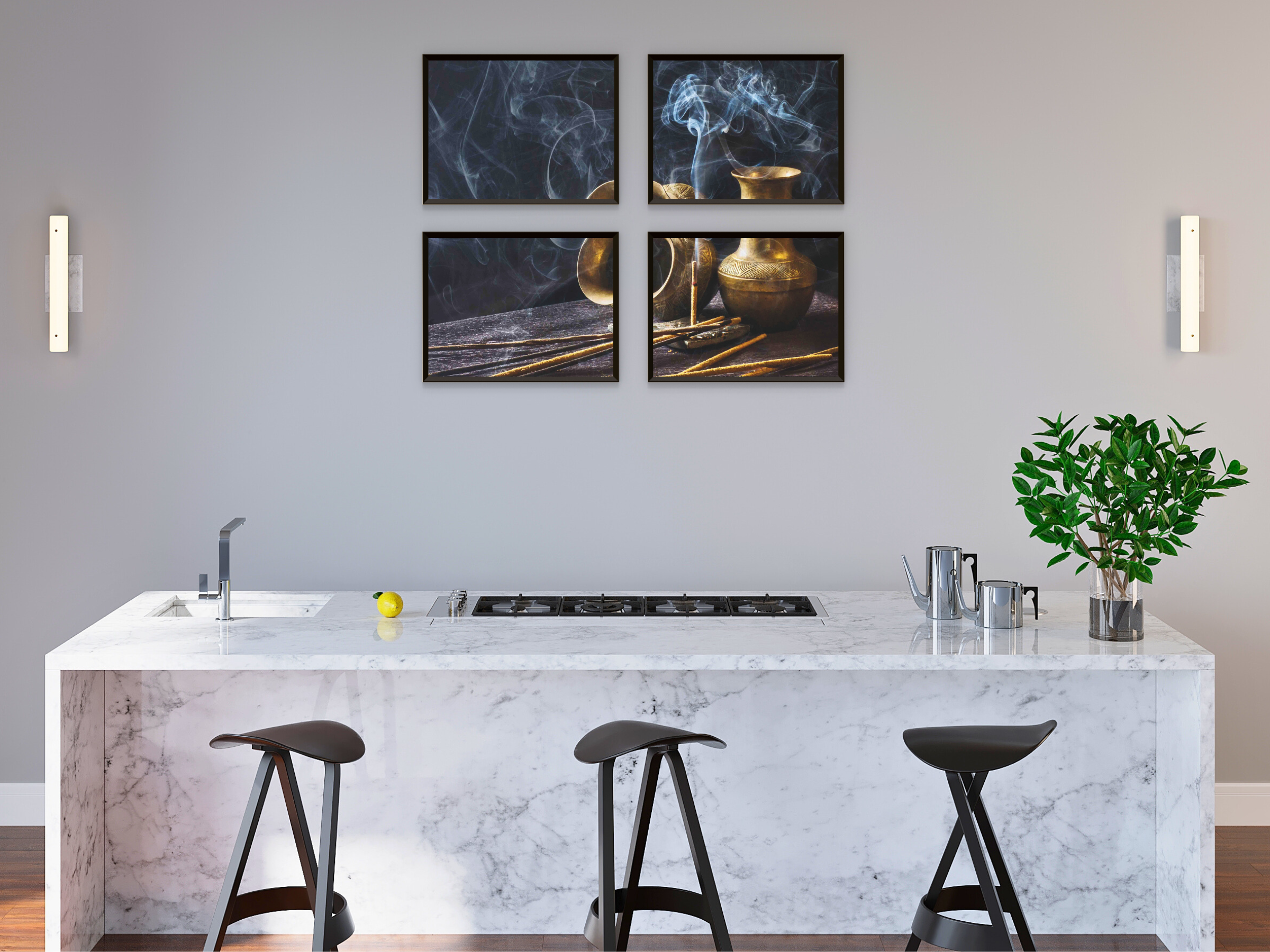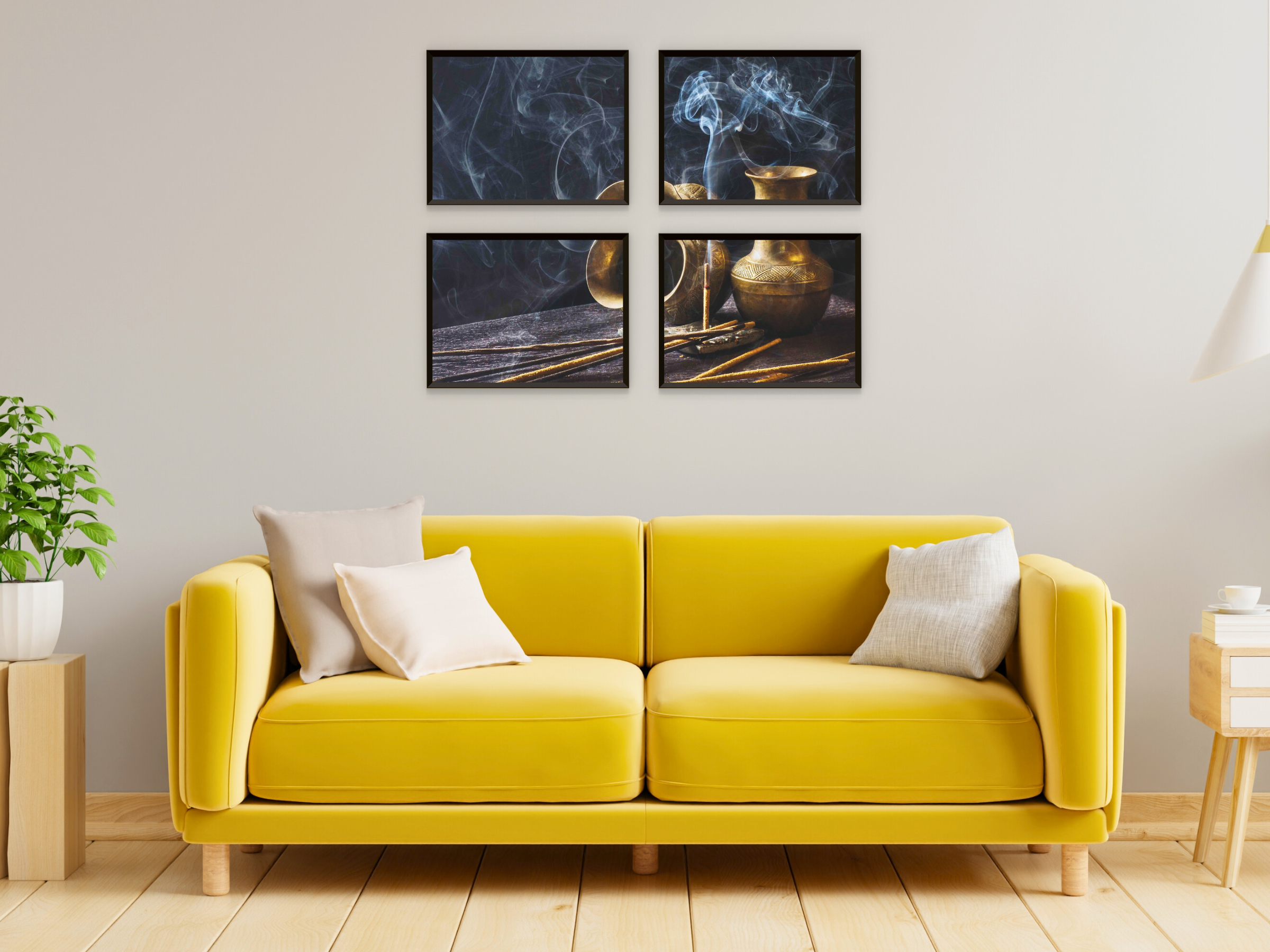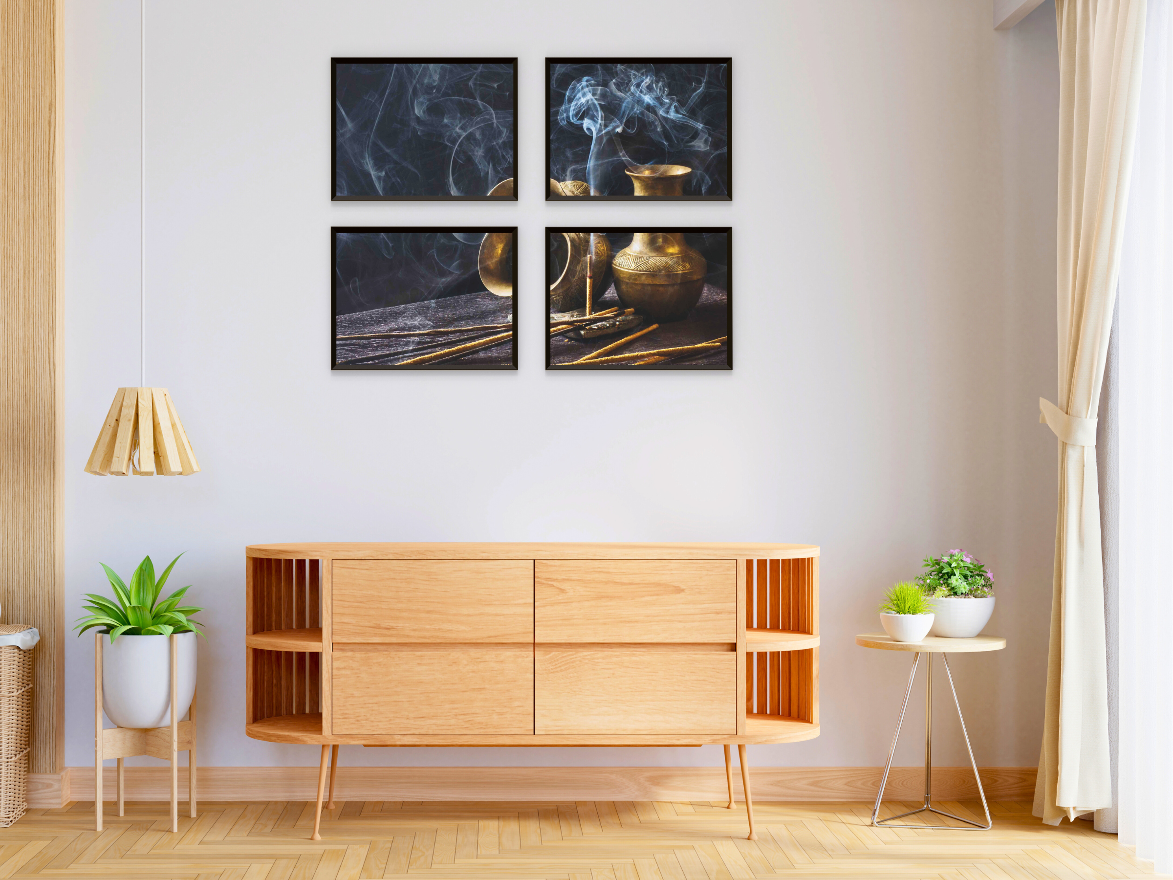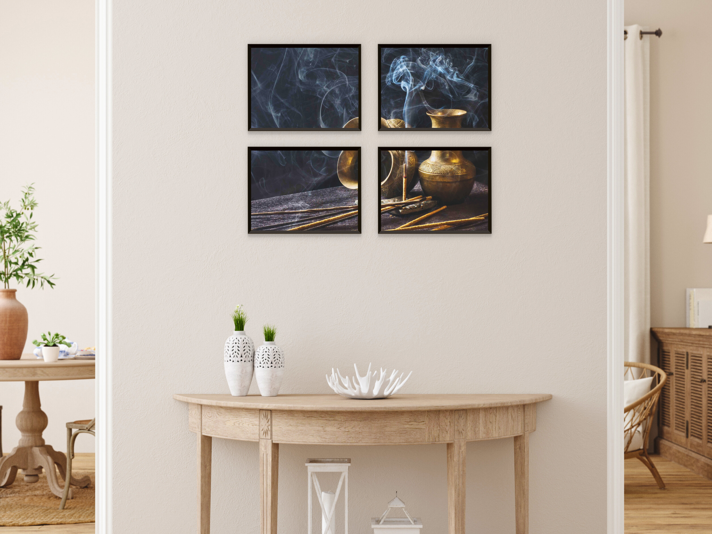 Encens brûlant avec des bâtonnets - Photographie en quatre parties : Une photographie en quatre parties de bâtonnets d'encens lors d'une cérémonie d'encens empreinte d'atmosphère. Cette décoration murale à imprimer apporte une ambiance relaxante et une touche d'art naturel à votre intérieur.
