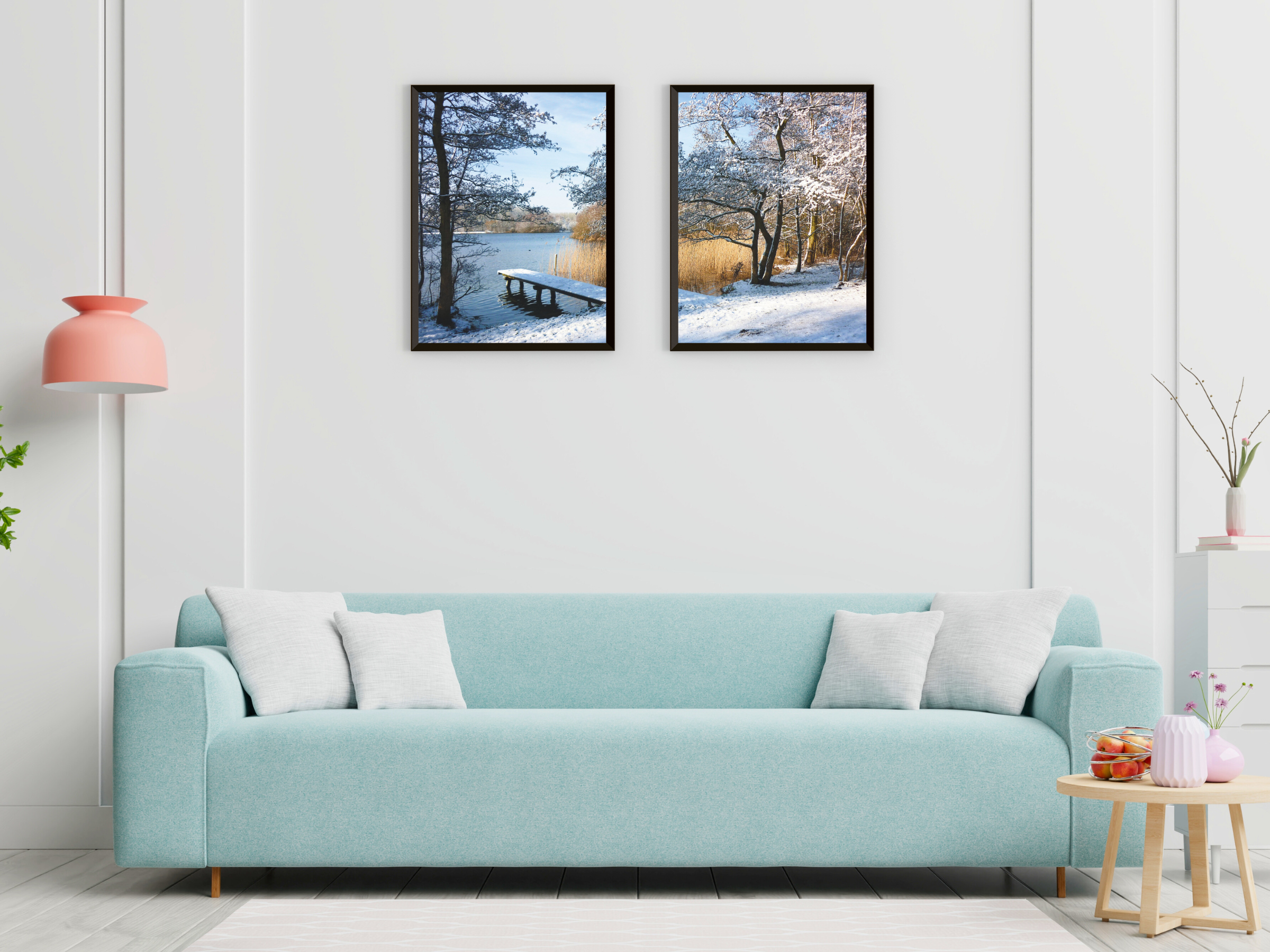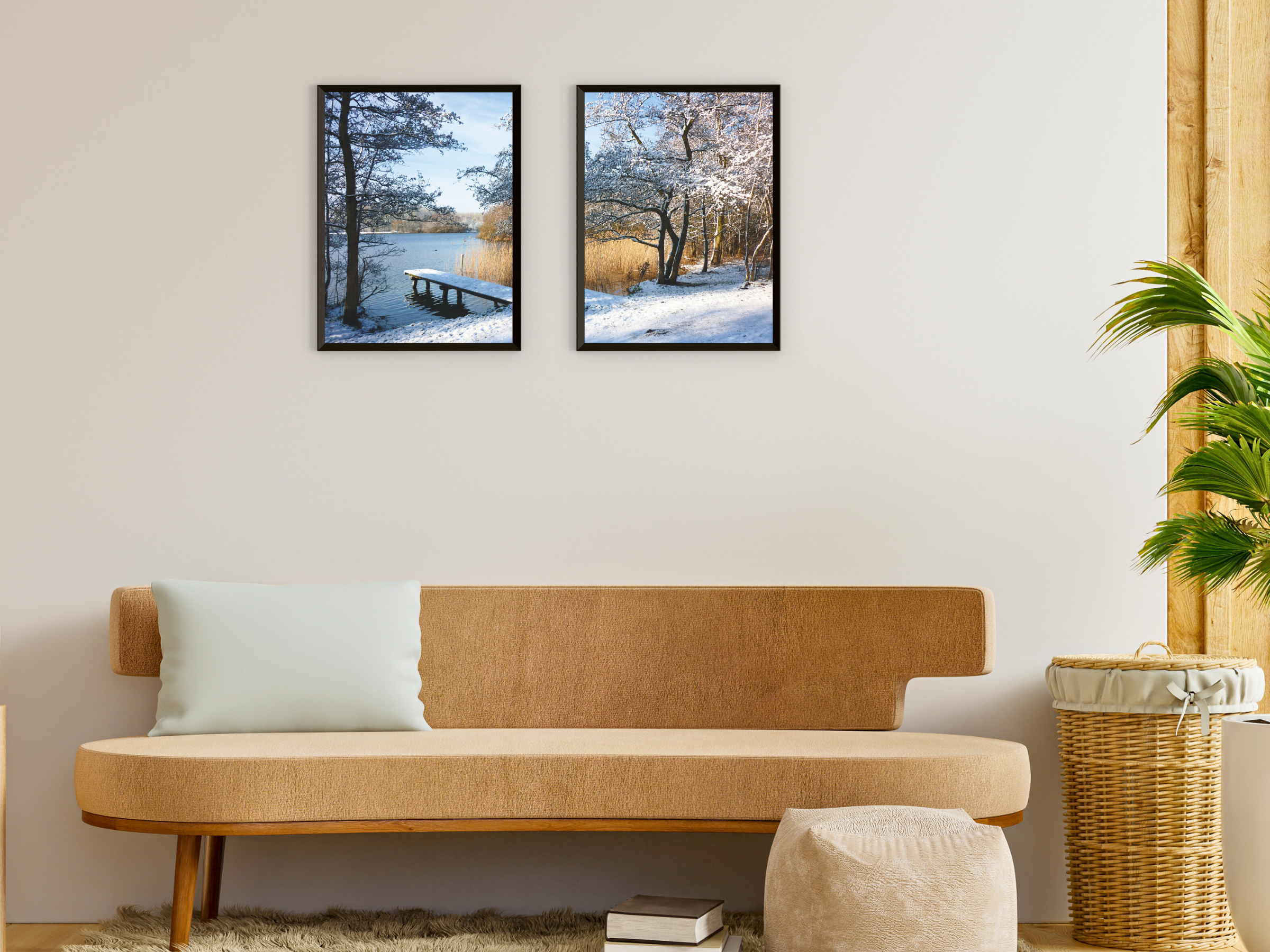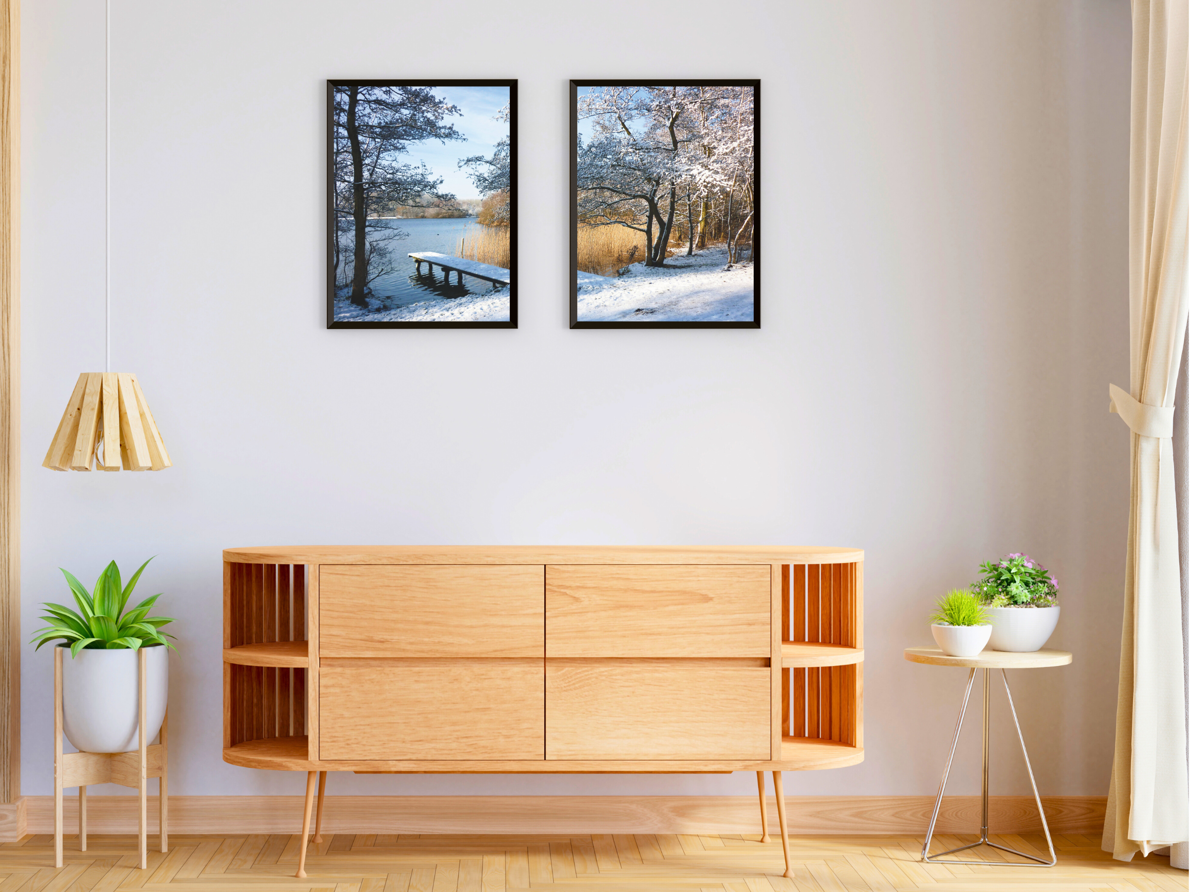 Paysage d'hiver au bord d'un lac - Photographie en deux parties - Une photographie en deux parties d'un paysage d'hiver féérique au bord d'un lac , idéale comme décoration murale à imprimer . Apportez la sérénité de l'hiver dans votre intérieur. Parfait pour les amateurs d'art et de photographie de nature .